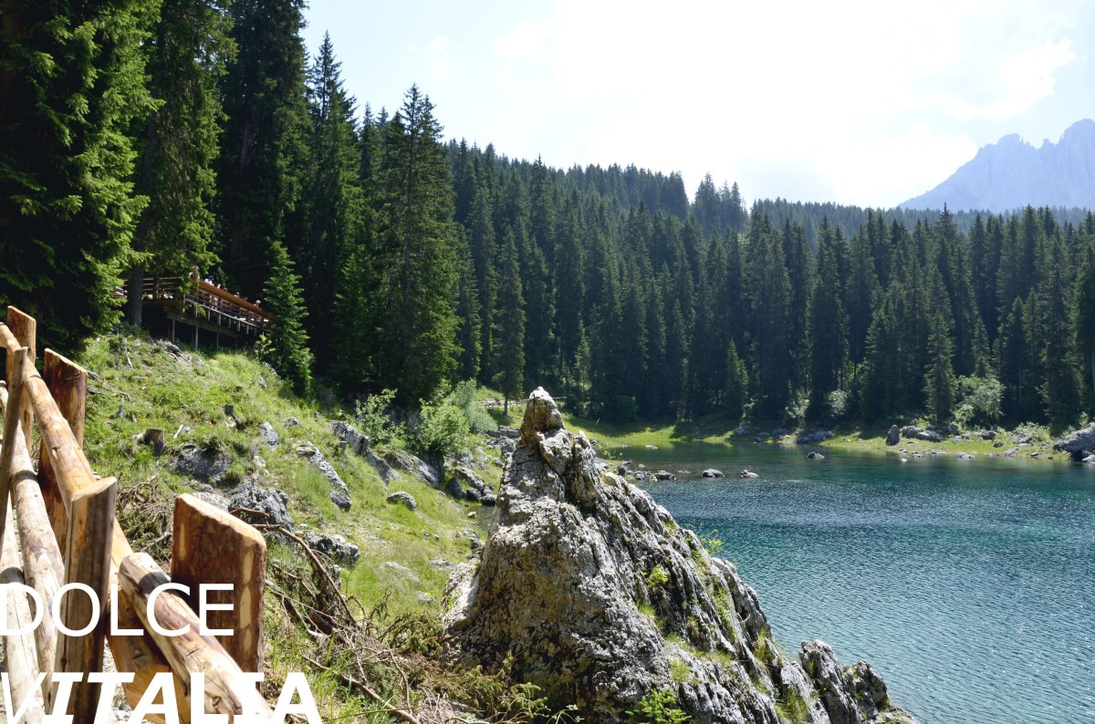 Lago di Carezza, the brightest and cleanest lake I have ever seen. Latemar rises behind the trees.