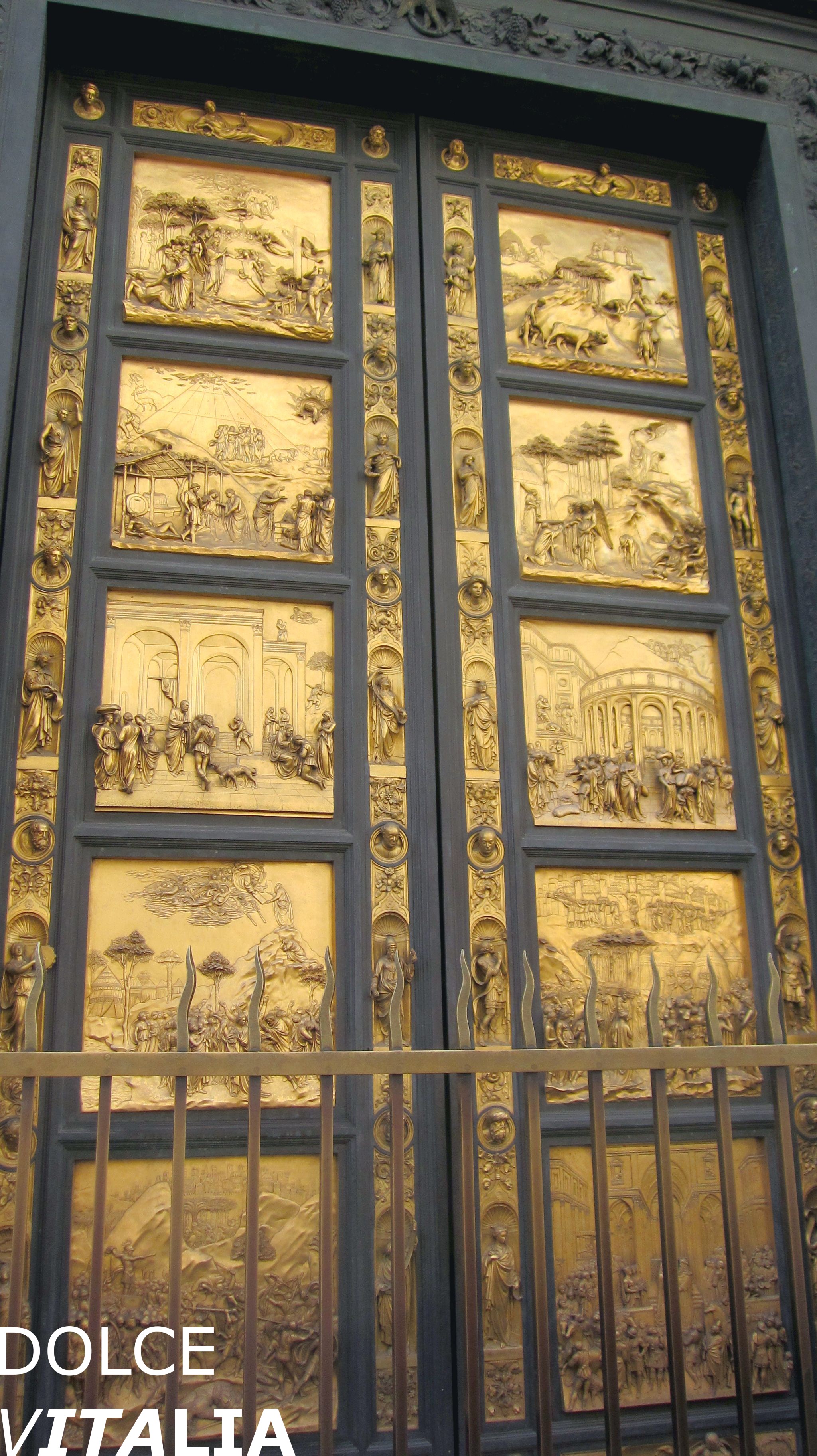 Baptistery located in Piazza del Duomo. On three of the four sides there are three large doors famous for their decorations. The oldest pair of doors are the bronze doors presently found on the South side of the baptistery. Made by Andrea Pisano around 1330, the doors consist of 28 quatrefoil panels depicting scenes from St. John’s life.