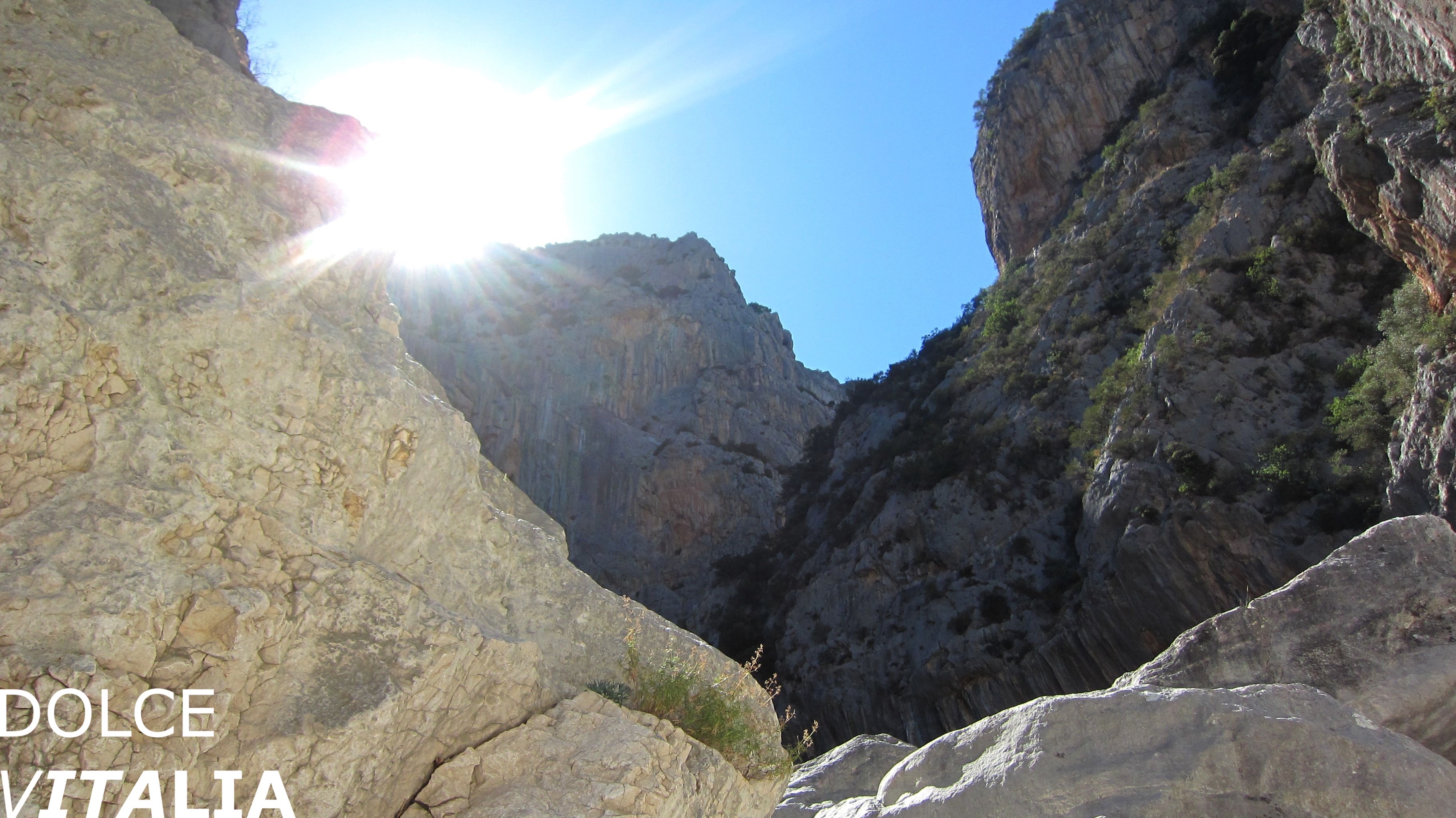 The sun is still visible before it hides behind half a kilometer high walls of Gorropu canyon